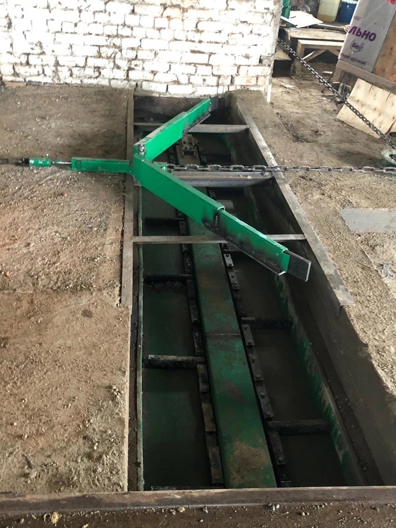Установка предназначена для уборки навоза крупного рогатого скота из открытых навозных проходов при беспривязном боксовом содержании скота.