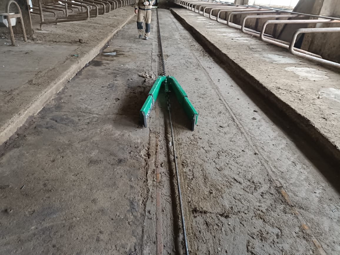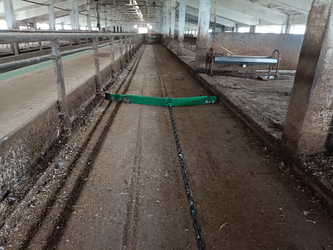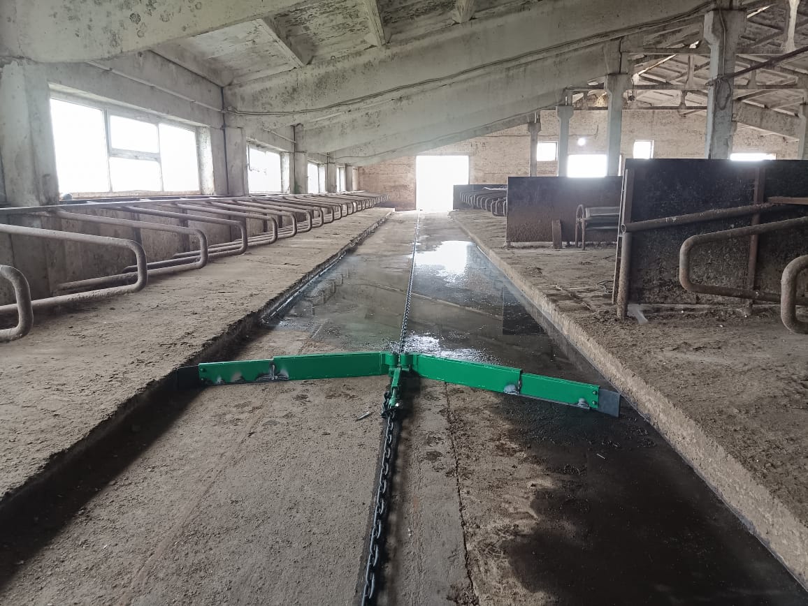 Скрепер комплектуется четырьмя рабочими органами, что позволяет осуществить выгрузку навоза, как из торца, так и середины помещения
